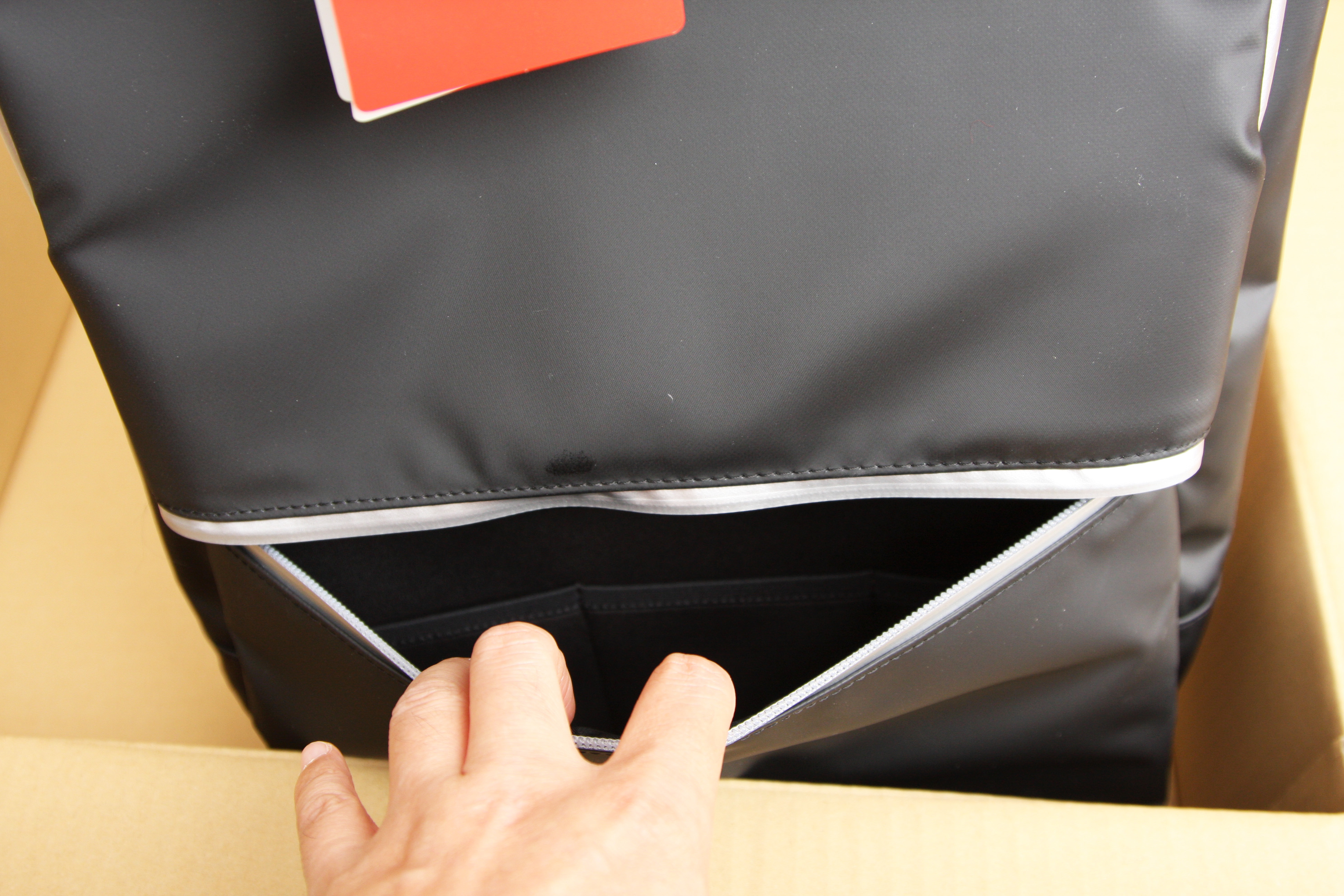 続きましてショルダーベルト側にある収納スペースです。ここには、ノートパソコンやタブレットなどを入れることができます。中に間仕切りがあり、クッション仕様になっています。